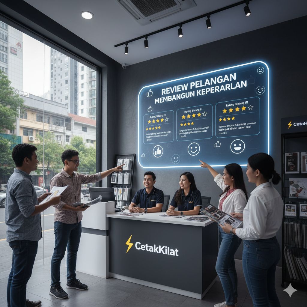 Contohnya, jika sebuah percetakan menerima banyak review positif mengenai kualitas undangan pernikahan, brosur promosi, atau banner acara, calon pelanggan baru akan lebih yakin untuk menggunakan jasa tersebut. Menurut HubSpot (2024), review positif bisa meningkatkan tingkat kepercayaan pelanggan baru hingga 73%.