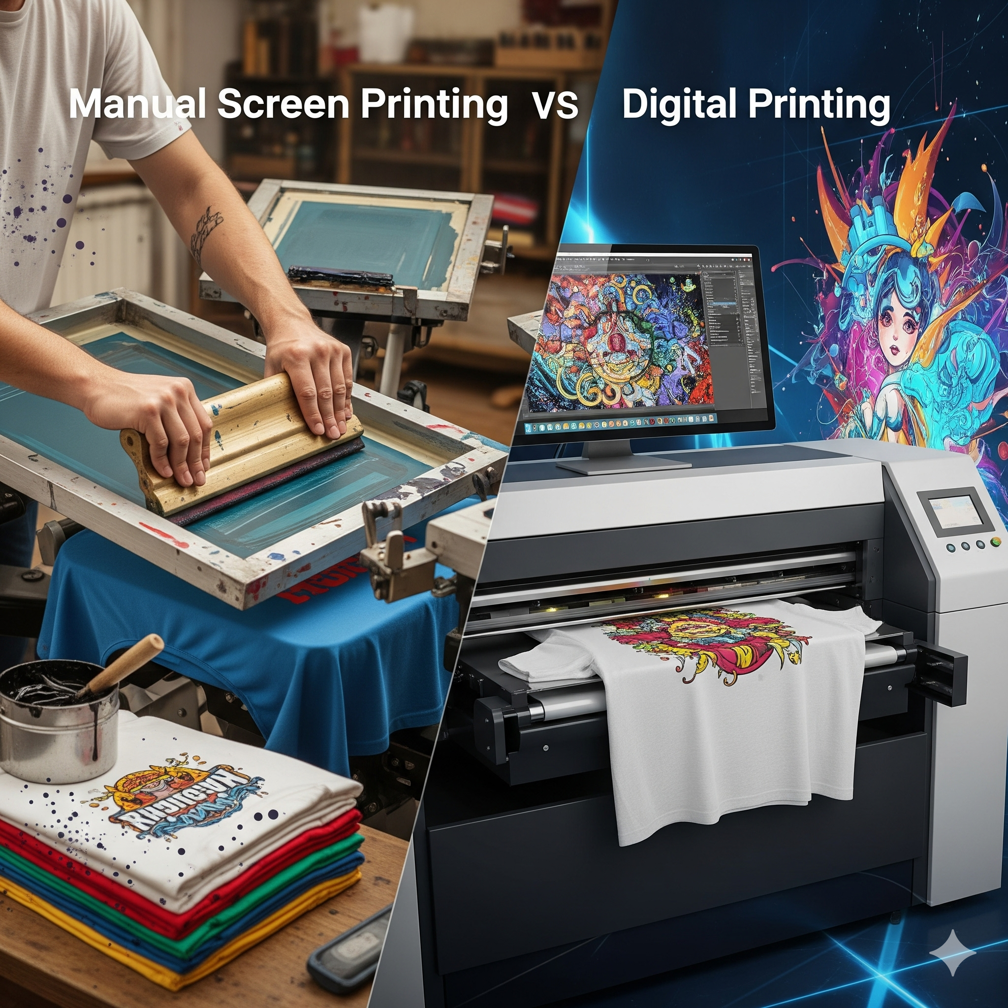 Bedanya sablon manual vs printing digital terletak pada cara produksi, ketahanan warna, jumlah cetakan, dan detail desain.
