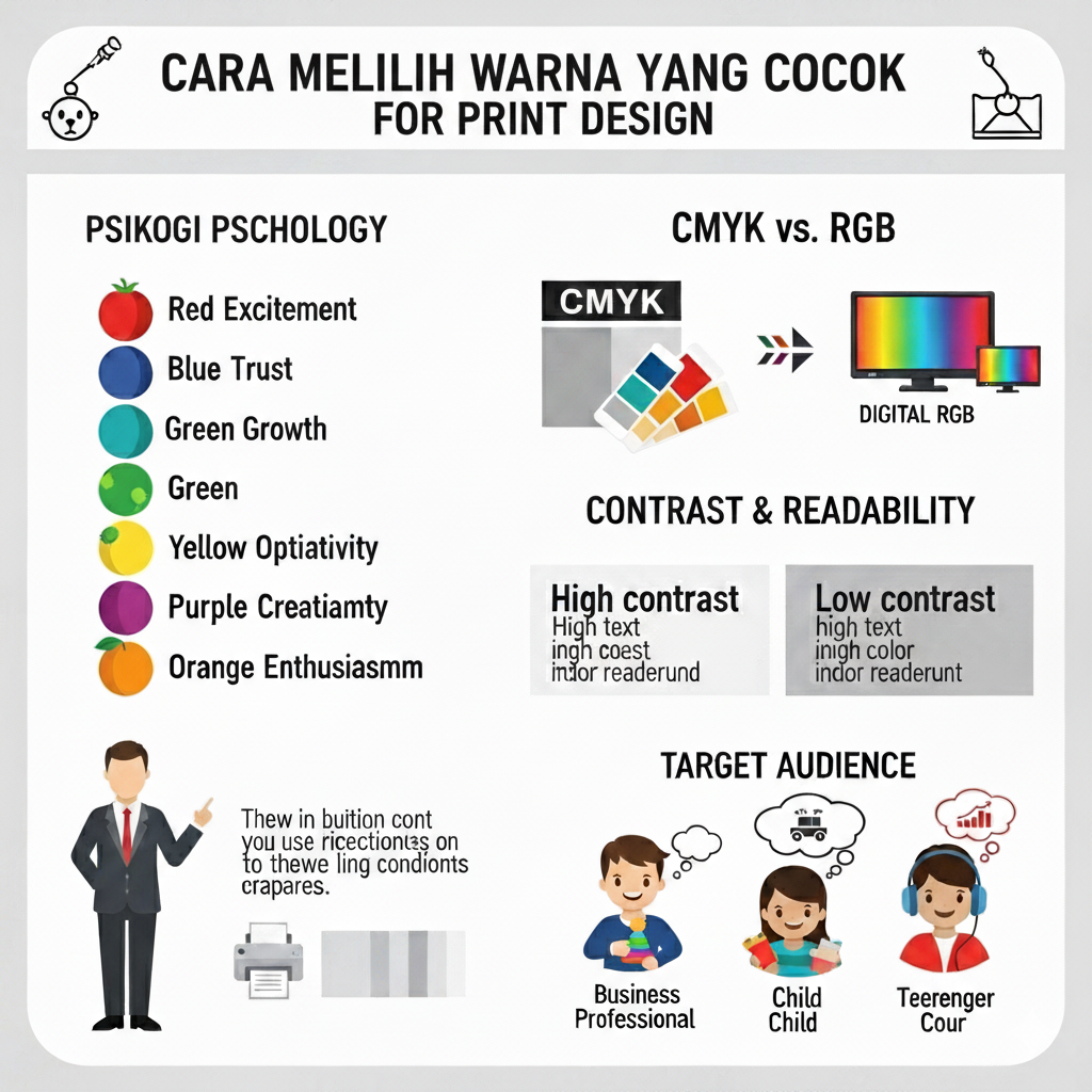 Salah satu kesalahan umum pemula adalah memilih warna berdasarkan tampilan layar komputer atau ponsel tanpa mempertimbangkan hasil cetaknya. Layar menggunakan mode RGB (Red, Green, Blue), sedangkan mesin cetak menggunakan CMYK (Cyan, Magenta, Yellow, Black).