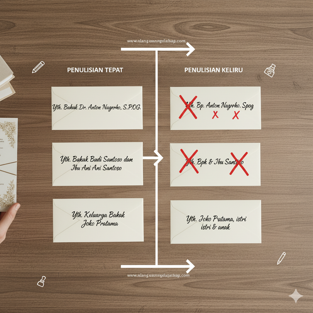 Gunakan format yang konsisten untuk semua undangan agar terlihat rapi dan profesional. Hindari penulisan seperti “Bpk/Ibu Ahmad” karena bisa dianggap tidak sopan menurut kaidah penulisan undangan yang baik (sumber: Wedding Market Indonesia, 2024).