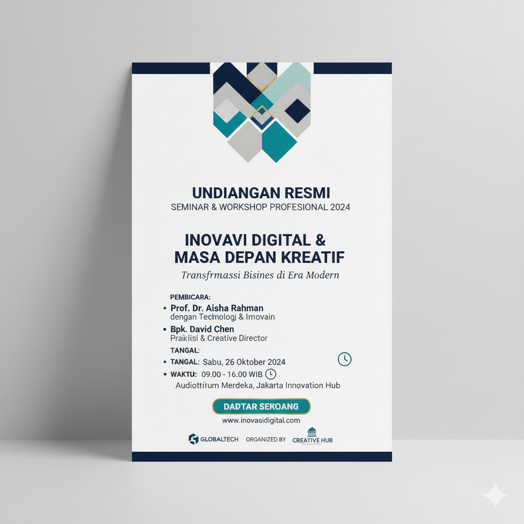 Desain undangan seminar atau workshop yang profesional bukan sekadar tampilan visual semata, tetapi juga cerminan kualitas acara dan penyelenggaranya. Dengan memperhatikan elemen desain seperti tata letak, warna, tipografi, serta informasi yang jelas, undangan Anda akan terlihat lebih kredibel dan menarik.