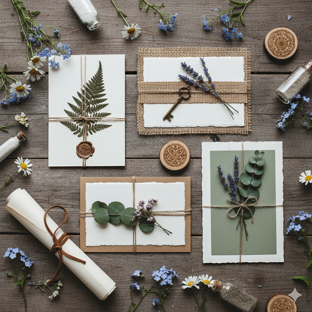 Bahan seperti kertas daur ulang, kartu kraft, atau linen paper sangat umum digunakan. Tekstur alami memberikan kesan “handmade” yang hangat dan elegan.