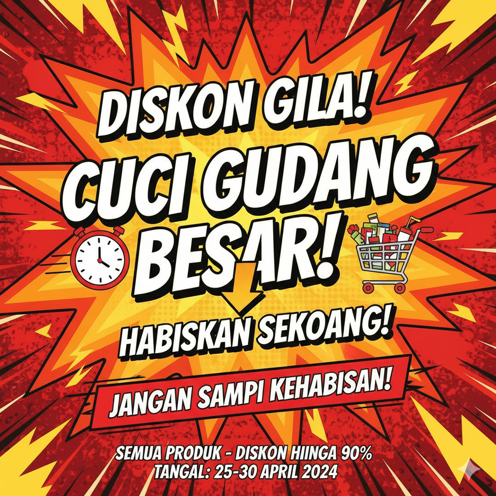 “CUCI GUDANG BESAR-BESARAN! Diskon hingga 80%! Stok Terbatas!”
