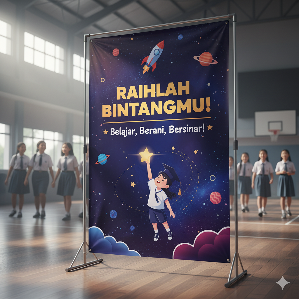 Spanduk motivasi bukan sekadar dekorasi, tetapi juga alat komunikasi visual yang menyebarkan semangat positif kepada siswa dan guru. Dengan pesan yang tepat, warna menarik, dan desain yang terkonsep, spanduk bisa menjadi elemen penting dalam setiap acara sekolah.