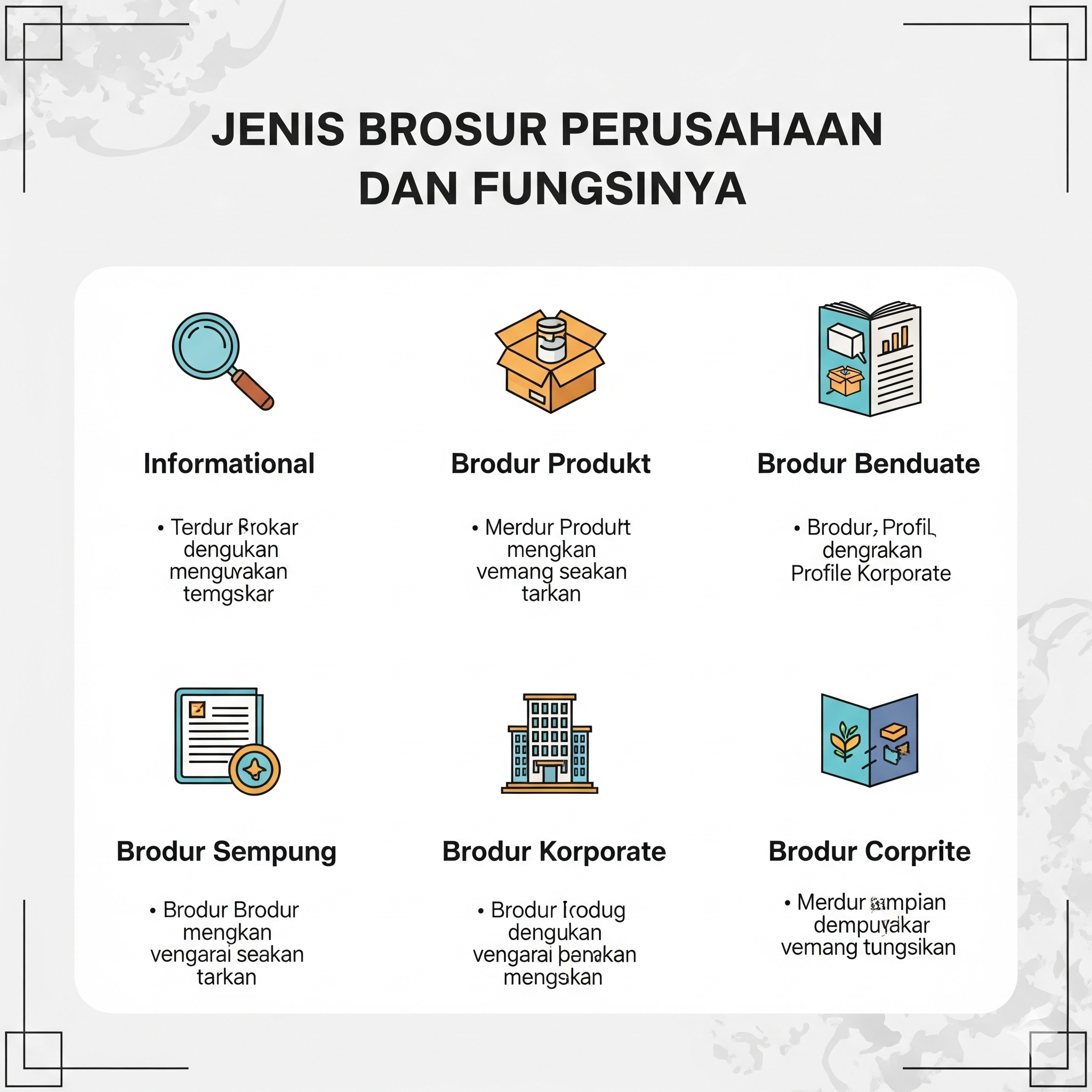 Setiap jenis brosur memiliki karakteristik dan fungsi yang berbeda. Berikut adalah penjelasan jenis-jenis brosur perusahaan yang paling umum digunakan: