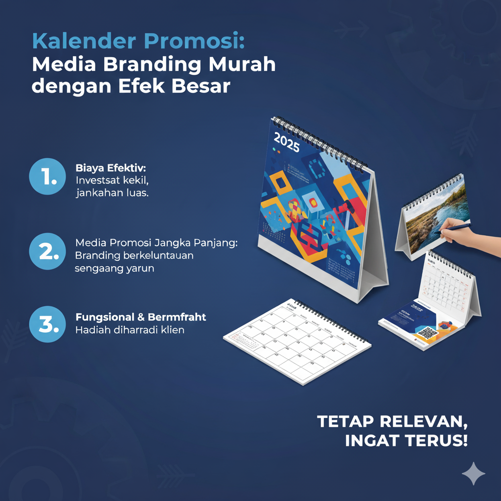 Kalender promosi adalah media branding yang murah namun punya efek besar untuk jangka panjang. Dengan biaya produksi rendah, kalender mampu memperkenalkan brand selama 12 bulan penuh tanpa harus repot berulang kali membayar iklan.