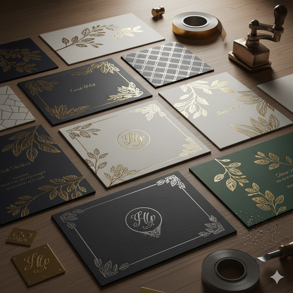 Meskipun emas dan perak paling populer, teknik foil kini hadir dalam banyak variasi warna: rose gold, biru metalik, hijau zamrud, dan hologram.