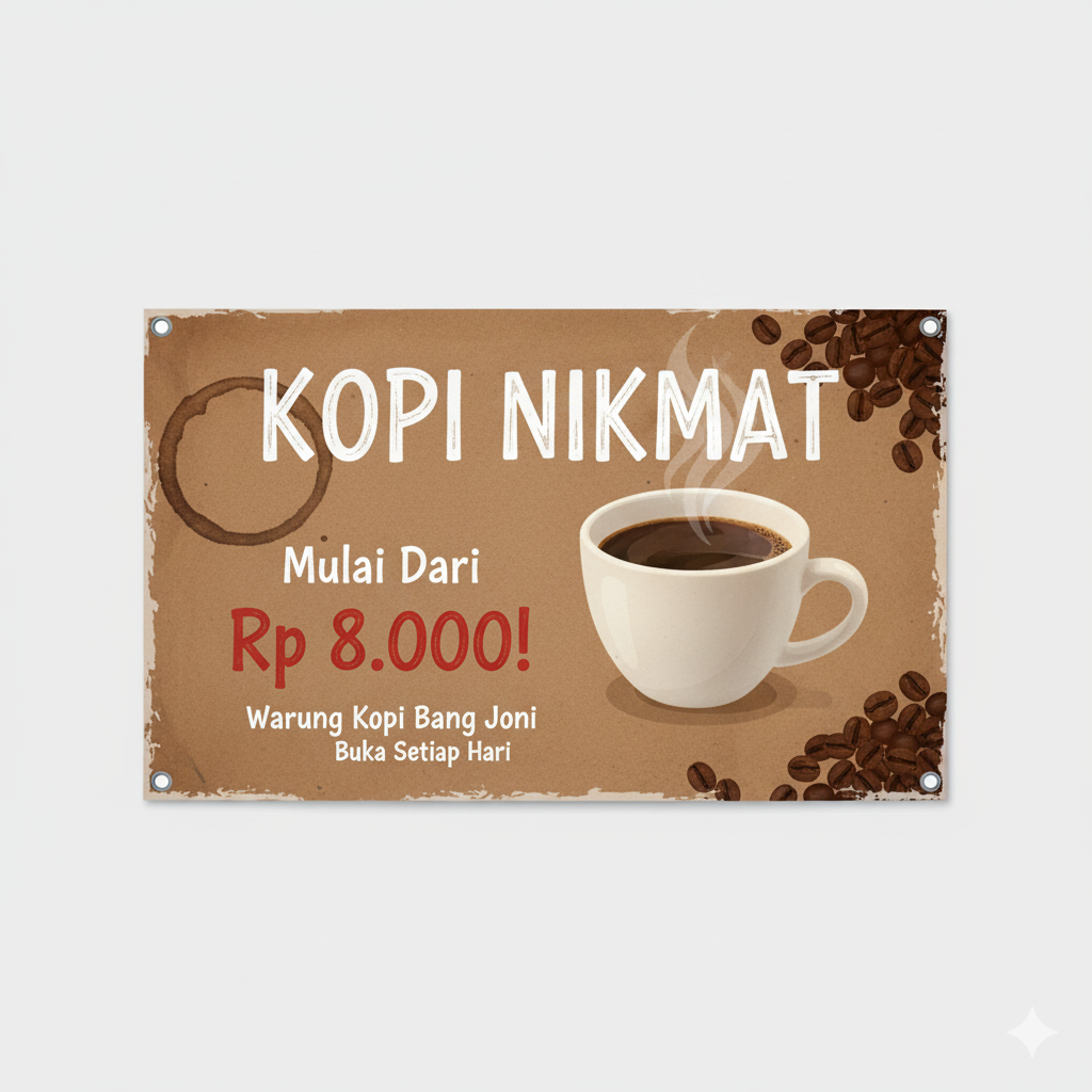 Spanduk memiliki fungsi ganda: sebagai identitas visual dan alat promosi. Saat orang lewat di depan warung kopi Anda, spanduk yang menarik bisa langsung memunculkan rasa ingin mencoba. Terutama jika menampilkan foto kopi panas yang menggoda atau promo “Ngopi 10 ribu Gratis Wifi.”