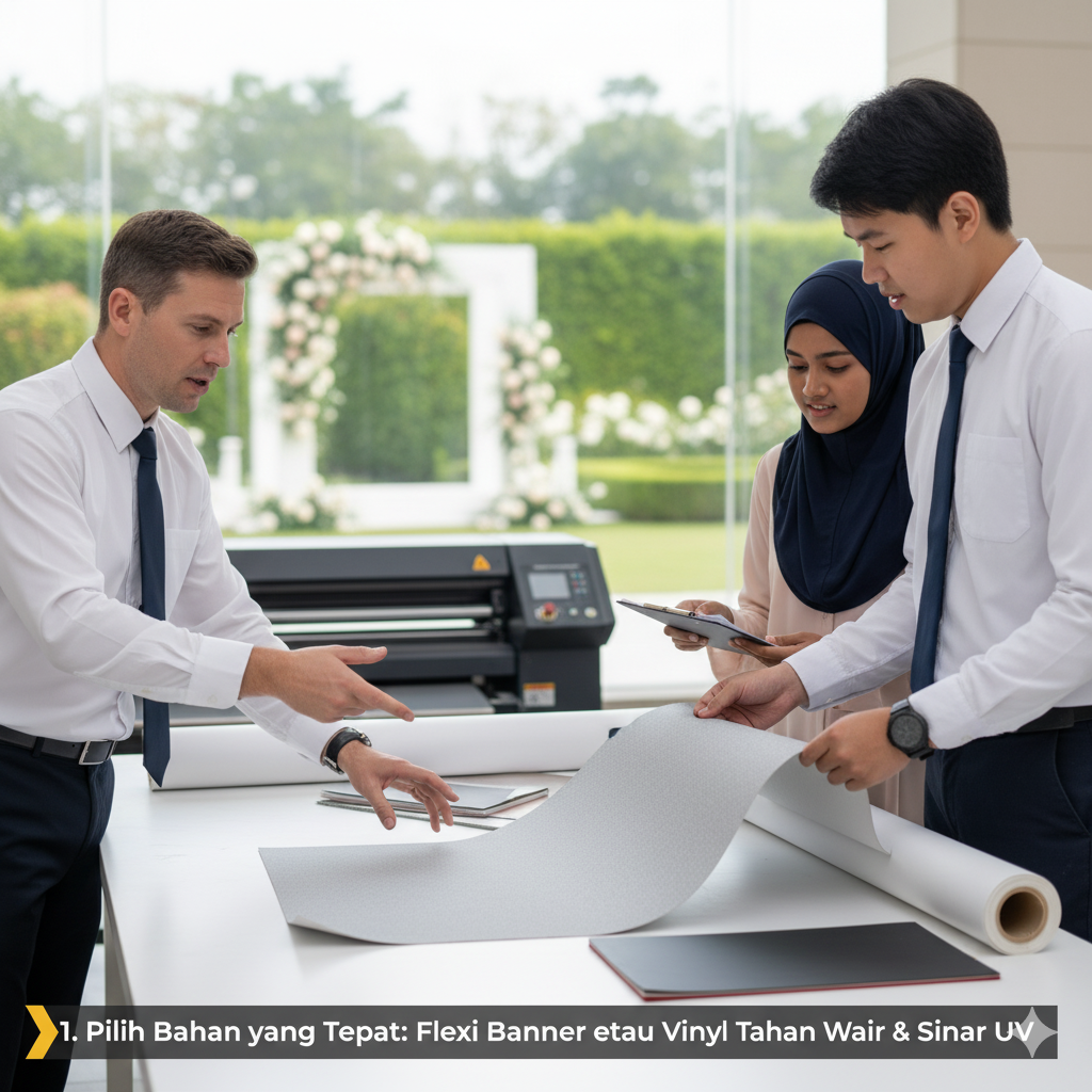 Agar spanduk pernikahan outdoor Anda tidak mudah rusak, pemilihan bahan adalah hal paling penting. Berikut beberapa bahan spanduk yang direkomendasikan: