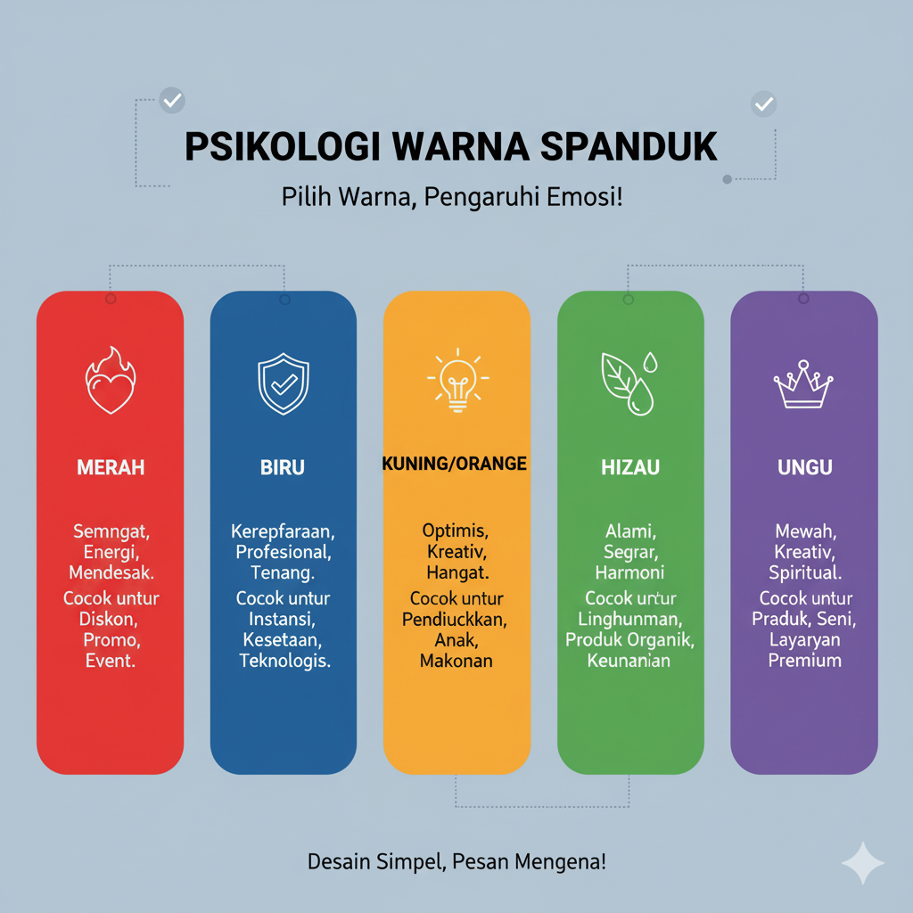 Berikut penjelasan sederhana mengenai arti dan efek psikologis dari beberapa warna populer yang sering digunakan dalam spanduk promosi: